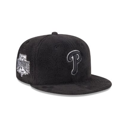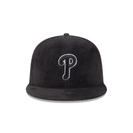 The Just Caps Static Logo Philadelphia Phillies 59FIFTY Fitted Cap features a black and white embroidered Phillies logo at the