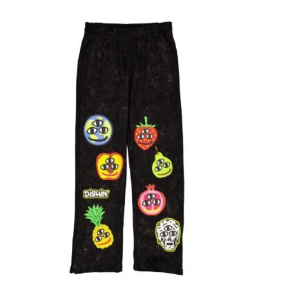 The DISHIN® Sweatpants features a screen-printed DISHIN® wordmark and characters at the front with star details and an embroidered New