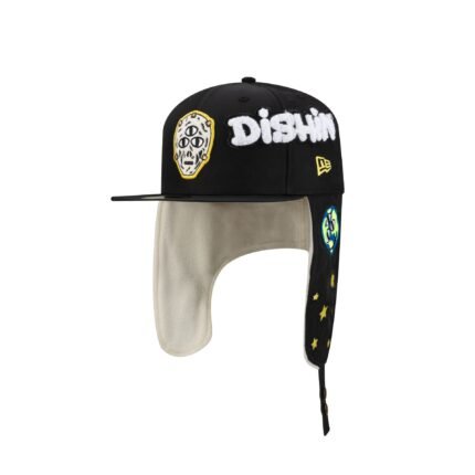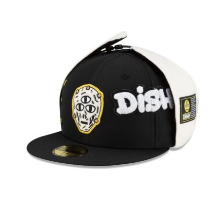 The DISHIN® Dog Ear 59FIFTY Fitted Cap features an embroidered DISHIN® mask patch at the front panels with a chenille