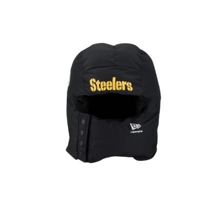 The Pittsburgh Steelers Helmet Puffer Hood features an embroidered Steelers wordmark at the front with a helmet design at each