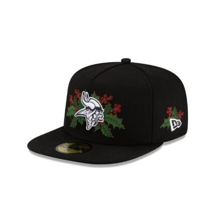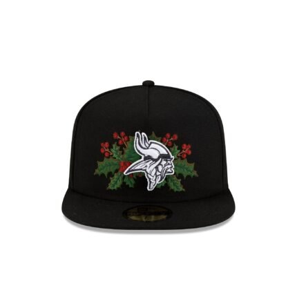 The Minnesota Vikings Holly 59FIFTY A-Frame Fitted Cap features an embroidered Vikings black and white logo with holly at the