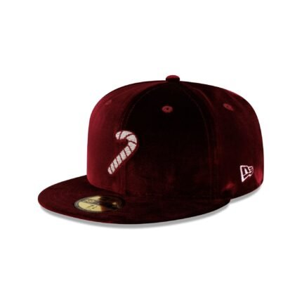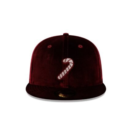 The New Era Cap Velvet Candy Cane 59FIFTY Fitted Cap features an embroidered candy cane at the front panels against