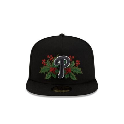 The Philadelphia Phillies Holly 59FIFTY A-Frame Fitted Cap features an embroidered Phillies black and white logo with holly at the