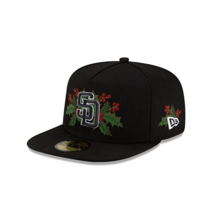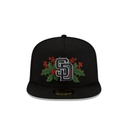 The San Diego Padres Holly 59FIFTY A-Frame Fitted Cap features an embroidered Padres black and white logo with holly at