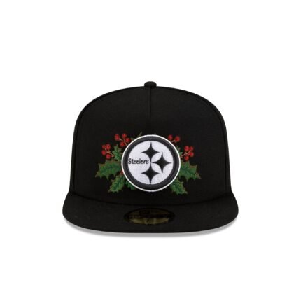 The Pittsburgh Steelers Holly 59FIFTY A-Frame Fitted Cap features an embroidered Steelers black and white logo with holly at the