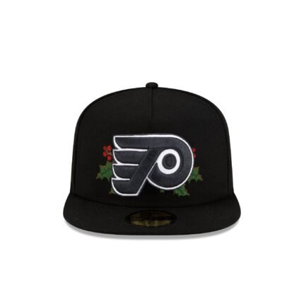 The Philadelphia Flyers Holly 59FIFTY A-Frame Fitted Cap features an embroidered Flyers black and white logo with holly at the