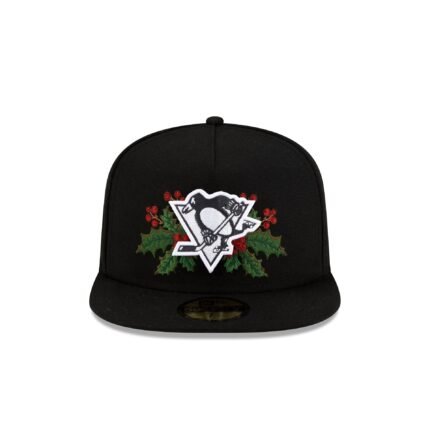 The Pittsburgh Penguins Holly 59FIFTY A-Frame Fitted Cap features an embroidered Penguins black and white logo with holly at the