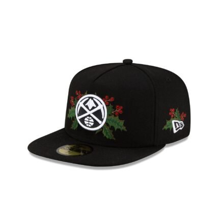 The Denver Nuggets Holly 59FIFTY A-Frame Fitted Cap features an embroidered Nuggets black and white logo with holly at the