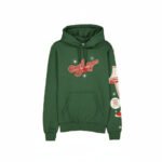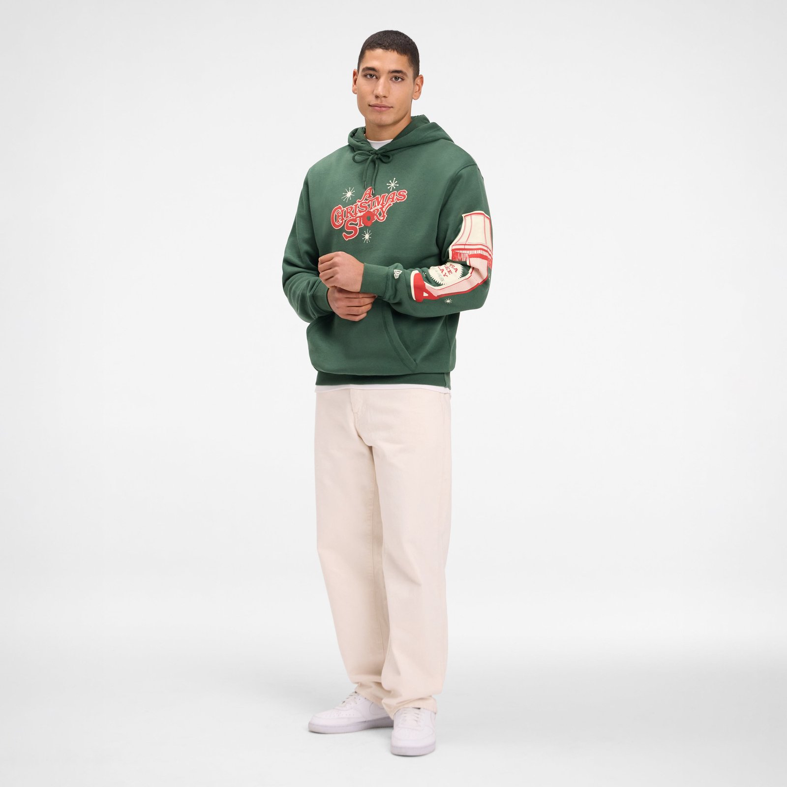 The A Christmas Story Green Hoodie features a screen-printed A Christmas Story graphic at the front, left arm, and rear. Additional details include kangaroo pockets and adjustable drawstrings at the hood.