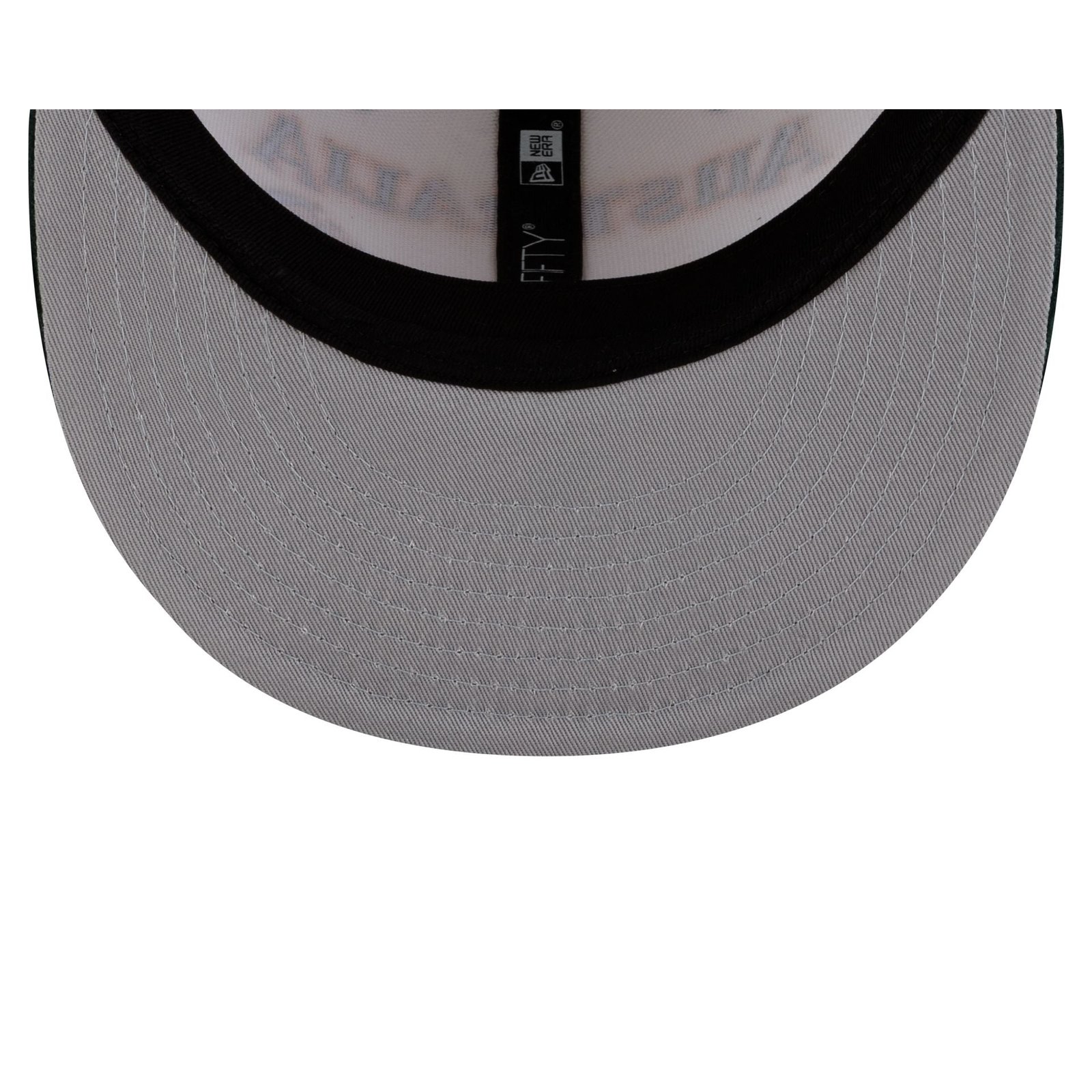The Australia 2025 World Baseball Classic Corduroy 9FIFTY Snapback features an embroidered Australia wordmark at the front panels against a corduroy fabrication with their Flag at the right-wear side. Additional details include the World Baseball Classic logo above an adjustable snapback closure at the rear and a green undervisor.