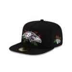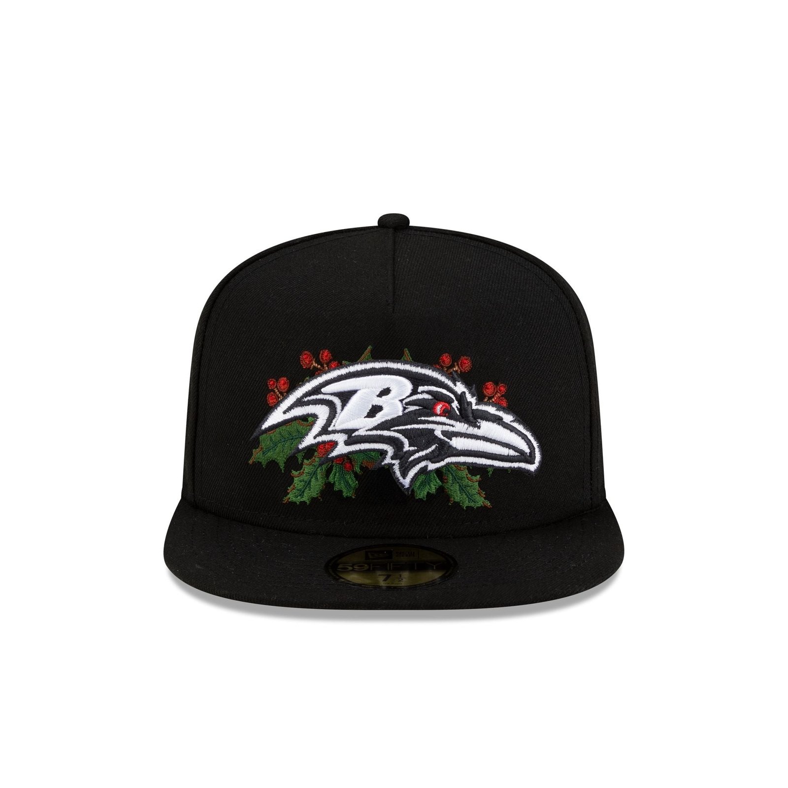 The Baltimore Ravens Holly 59FIFTY A-Frame Fitted Cap features an embroidered Ravens black and white logo with holly at the front panels with a matching NFL Shield logo at the rear. Additional details include a holly New Era Flag at the left-wear side and a black undervisor.