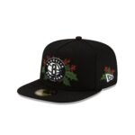 The Brooklyn Nets Holly 59FIFTY A-Frame Fitted Cap features an embroidered Nets black and white logo with holly at the front panels with a matching NBA Logoman at the rear. Additional details include a holly New Era Flag at the left-wear side and a black undervisor.