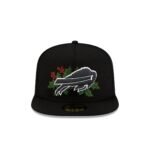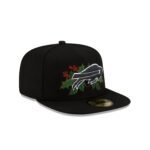 The Buffalo Bills Holly 59FIFTY A-Frame Fitted Cap features an embroidered Bills black and white logo with holly at the front panels with a matching NFL Shield logo at the rear. Additional details include a holly New Era Flag at the left-wear side and a black undervisor.