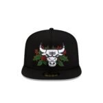 The Chicago Bulls Holly 59FIFTY A-Frame Fitted Cap features an embroidered Bulls black and white logo with holly at the front panels with a matching NBA Logoman at the rear. Additional details include a holly New Era Flag at the left-wear side and a black undervisor.