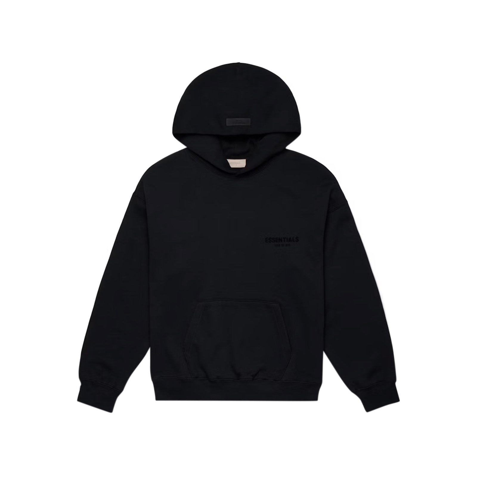 The Fear of God Essentials Pullover Chest Logo Hoodie Stretch Limo/Black is a minimalist statement piece, defined by its tonal chest ESSENTIALS logo and oversized, relaxed silhouette. The deep black fleece appears matte and substantial, with a roomy three-panel hood, kangaroo pocket and ribbed cuffs and hem that add texture and structure. Dropped shoulders and clean seams create a contemporary boxy fit that layers easily; the soft, cosy interior and reinforced trims deliver everyday comfort and shape retention. There’s no flashy tech – just thoughtful construction and premium simplicity. Perfect for streetwear rotation, it elevates denim, joggers or layered urban looks.