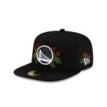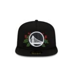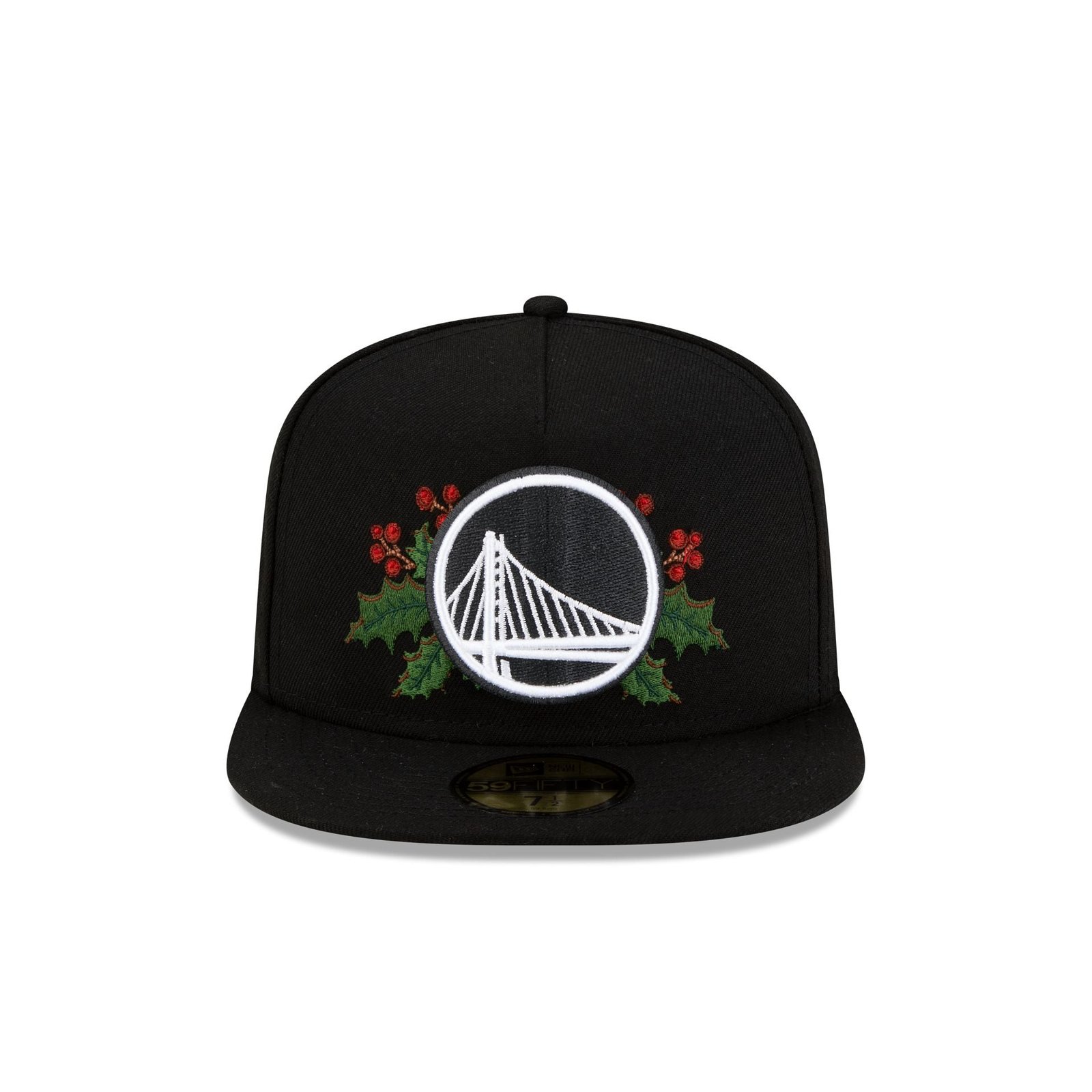 The Golden State Warriors Holly 59FIFTY A-Frame Fitted Cap features an embroidered Warriors black and white logo with holly at the front panels with a matching NBA Logoman at the rear. Additional details include a holly New Era Flag at the left-wear side and a black undervisor.