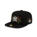 The Houston Astros Holly 59FIFTY A-Frame Fitted Cap features an embroidered Astros black and white logo with holly at the front panels with a matching MLB Batterman logo at the rear. Additional details include a holly New Era Flag at the left-wear side and a black undervisor.