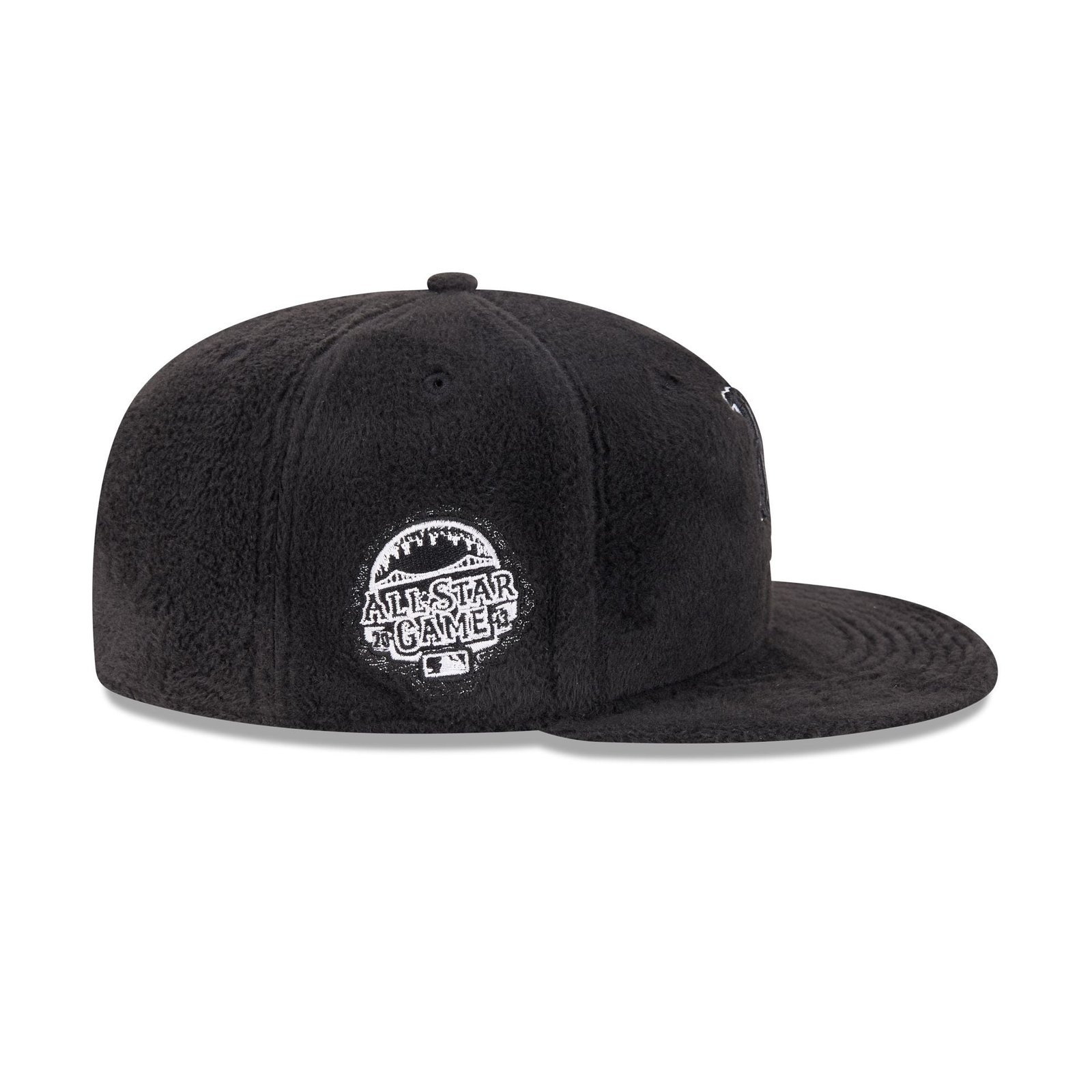 The Just Caps Static Logo New York Mets 59FIFTY Fitted Cap features a black and white embroidered Mets logo at the front panels with a matching MLB Batterman logo at the rear. Additional details include a 2013 All-Star Game patch at the right-wear side with a black fleece allover fabrication and a gray undervisor.