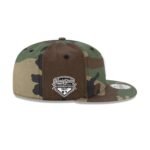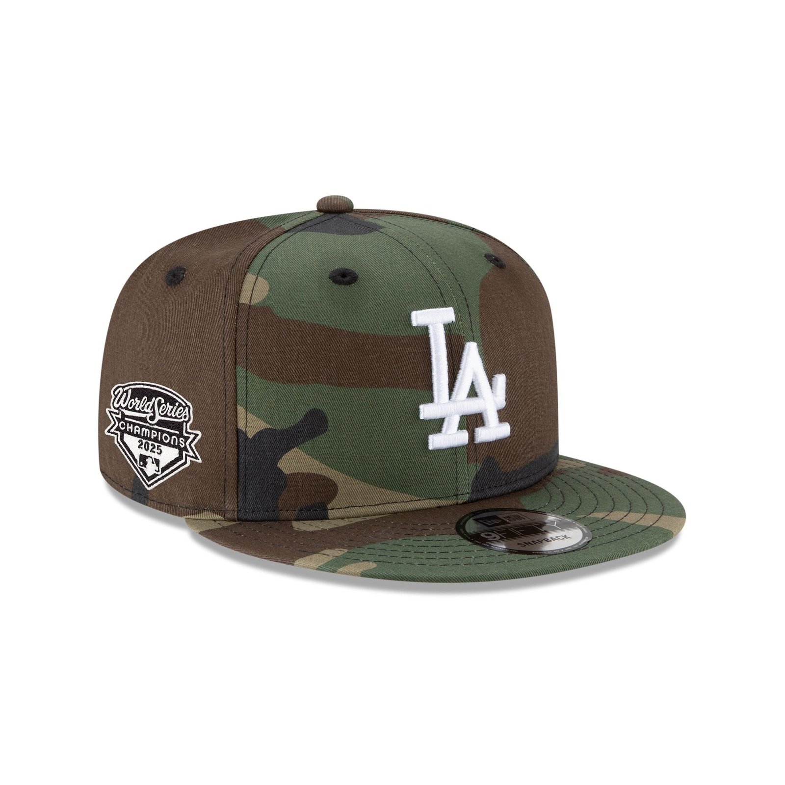 The Los Angeles Dodgers 2025 World Series Champions Camo 9FIFTY Snapback features an embroidered Dodgers logo at the front panels with a 2025 World Series Champions patch at the right-wear side and an adjustable snapback closure at the rear.