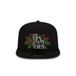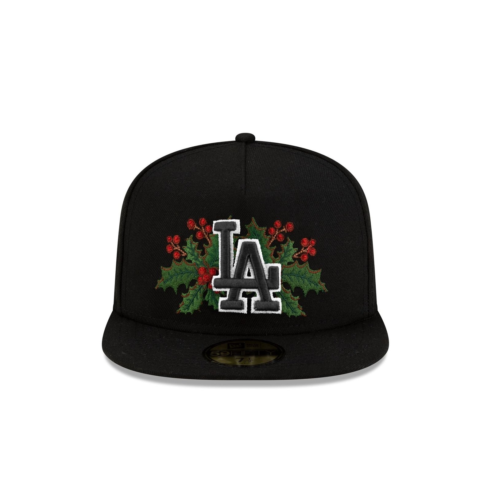 The Los Angeles Dodgers Holly 59FIFTY A-Frame Fitted Cap features an embroidered Dodgers black and white logo with holly at the front panels with a matching MLB Batterman logo at the rear. Additional details include a holly New Era Flag at the left-wear side and a black undervisor.