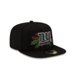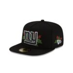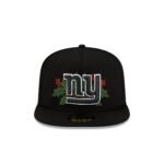 The New York Giants Holly 59FIFTY A-Frame Fitted Cap features an embroidered Giants black and white logo with holly at the front panels with a matching NFL Shield logo at the rear. Additional details include a holly New Era Flag at the left-wear side and a black undervisor.