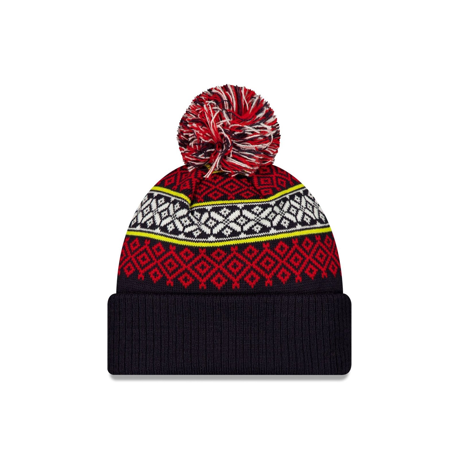 The Oracle Red Bull Racing Holiday Pom Knit features a silicone Oracle Red Bull Racing logo at the front cuff with a holiday stitch throughout the crown and a one-time removable pom.