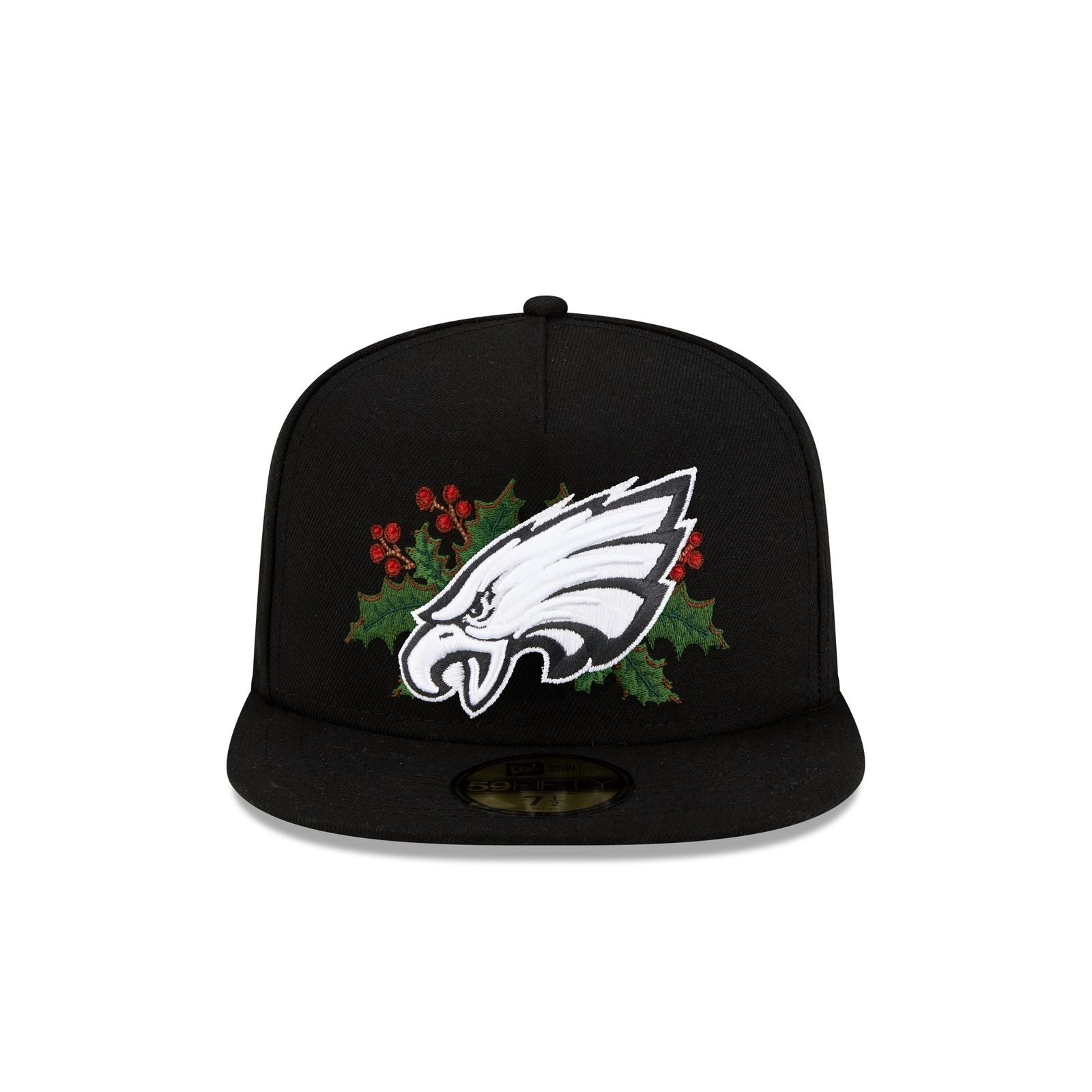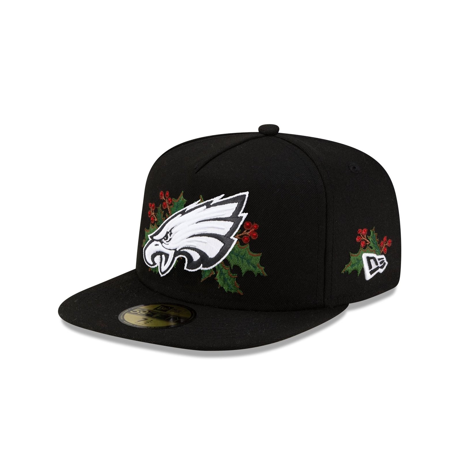 The Philadelphia Eagles Holly 59FIFTY A-Frame Fitted Cap features an embroidered Eagles black and white logo with holly at the front panels with a matching NFL Shield logo at the rear. Additional details include a holly New Era Flag at the left-wear side and a black undervisor.