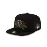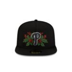The Philadelphia Phillies Holly 59FIFTY A-Frame Fitted Cap features an embroidered Phillies black and white logo with holly at the front panels with a matching MLB Batterman logo at the rear. Additional details include a holly New Era Flag at the left-wear side and a black undervisor.