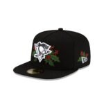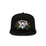 The Pittsburgh Penguins Holly 59FIFTY A-Frame Fitted Cap features an embroidered Penguins black and white logo with holly at the front panels with a matching NHL Shield logo at the rear. Additional details include a holly New Era Flag at the left-wear side and a black undervisor.