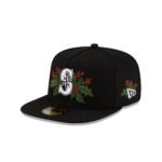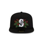 The Seattle Mariners Holly 59FIFTY A-Frame Fitted Cap features an embroidered Mariners black and white logo with holly at the front panels with a matching MLB Batterman logo at the rear. Additional details include a holly New Era Flag at the left-wear side and a black undervisor.
