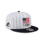 The Team USA Biathlon 9FIFTY Snapback features an embroidered USA logo at the front panels with a sport pictogram at the right-wear side. Additional details include an adjustable snapback closure at the rear with a navy visor and a green undervisor.