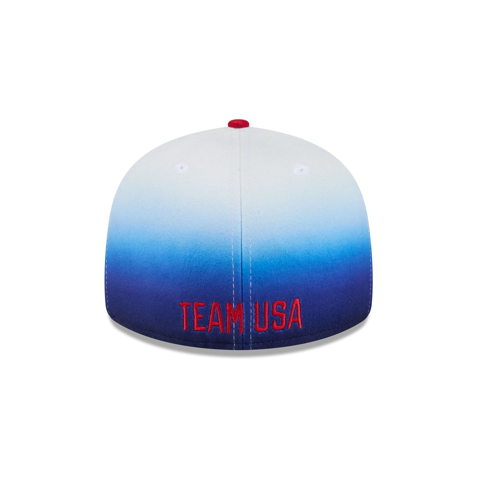 The Team USA Gradient Fleece Pre-Curve 59FIFTY Fitted Cap features an embroidered USA logo at the front panels with a matching team wordmark at the rear. Additional details include a blue and white gradient fleece crown with a red visor and a gray undervisor.