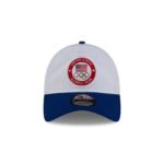 The Team USA Short Track Speed Skating 9TWENTY Adjustable Cap features an embroidered USA logo at the front panels with a sport pictogram at the right-wear side. Additional details include a dash mark mesh fabrication with an adjustable D-Ring closure at the rear, a blue visor, and a red undervisor.